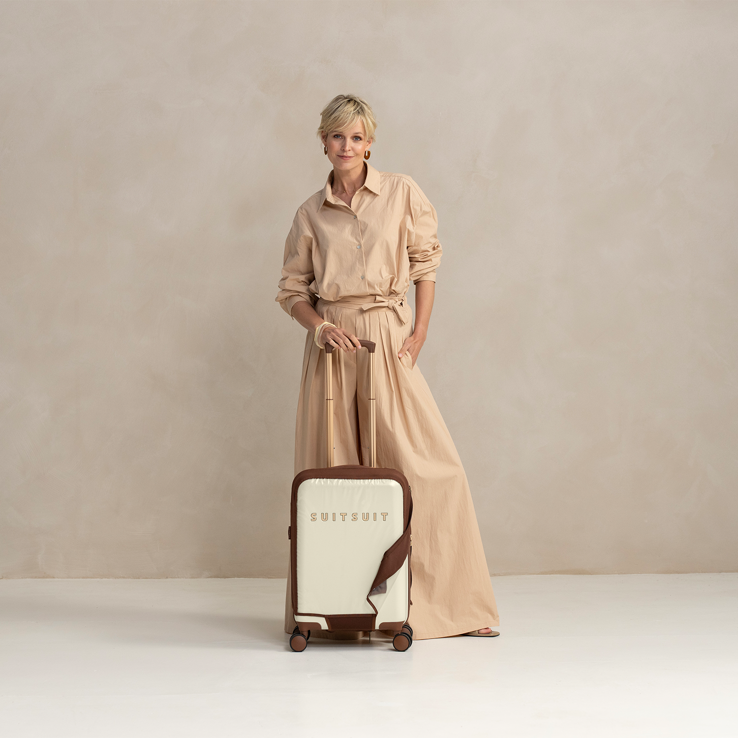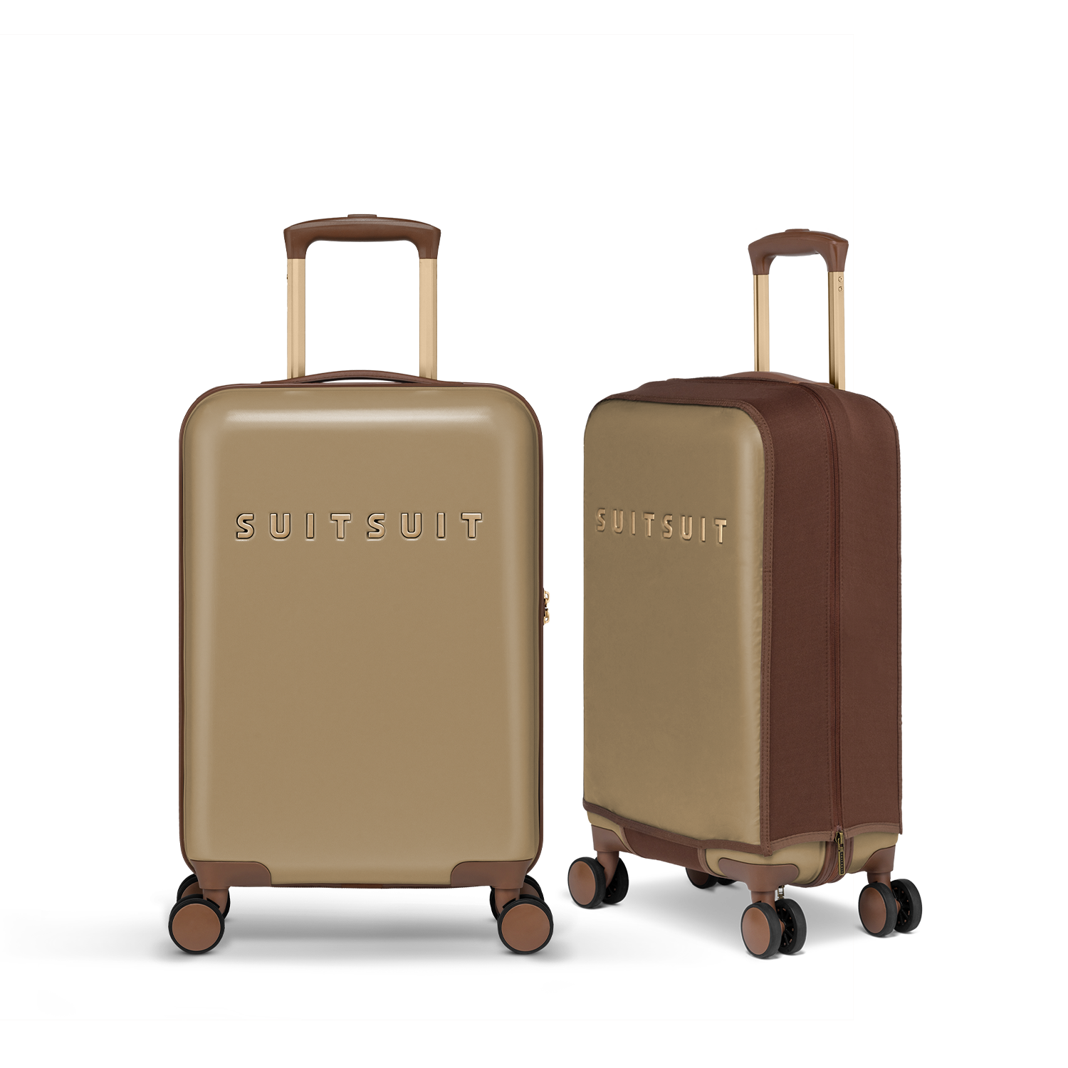 - Deze set bevat de Cuban Sand handbagage koffer (55cm) en de Burned Caramel beschermhoes (55cm).