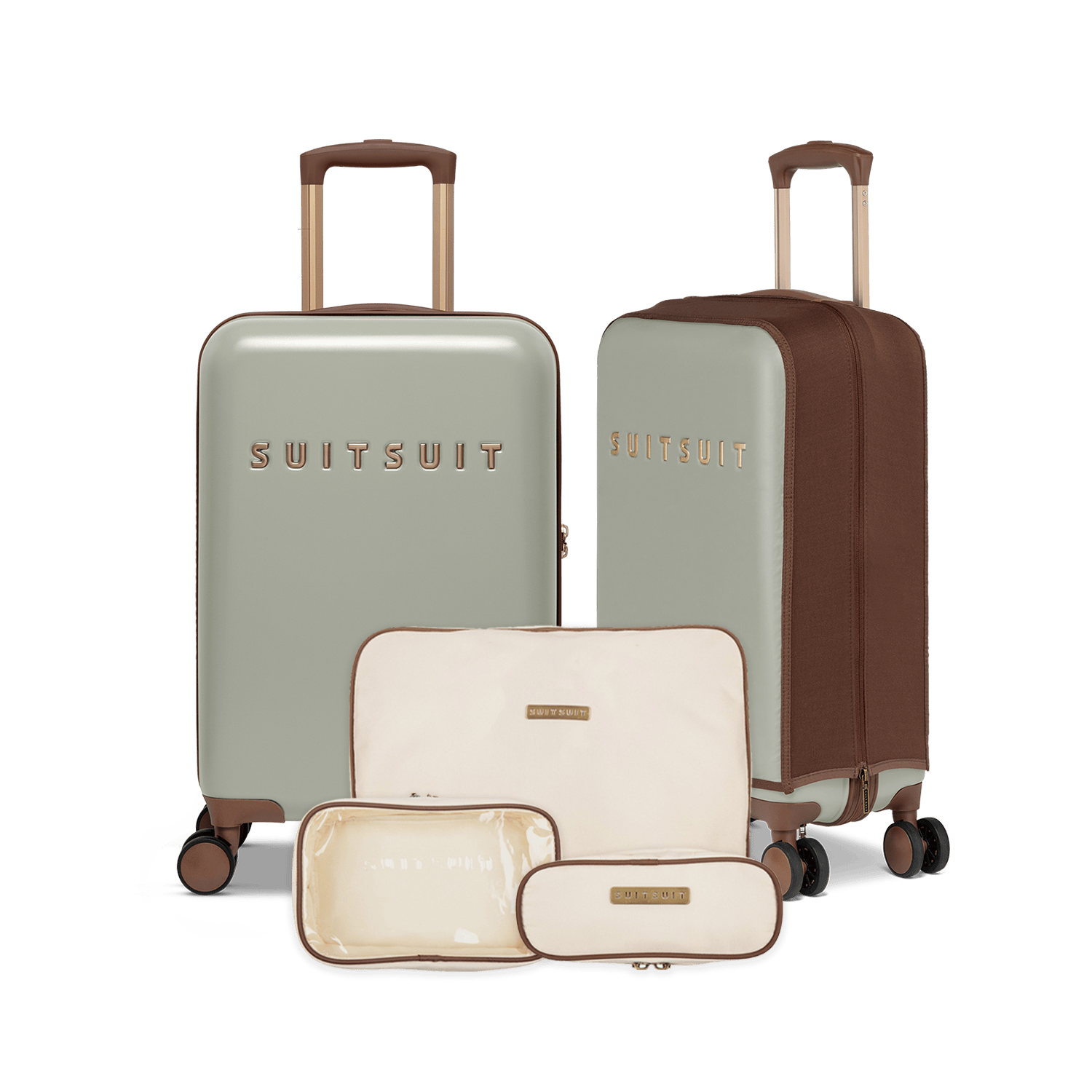 - Deze set bevat de Sustained Grey handbagage koffer (55cm), de Burned Caramel beschermhoes (55cm) en de Antique White Packing Cube Set (55cm).