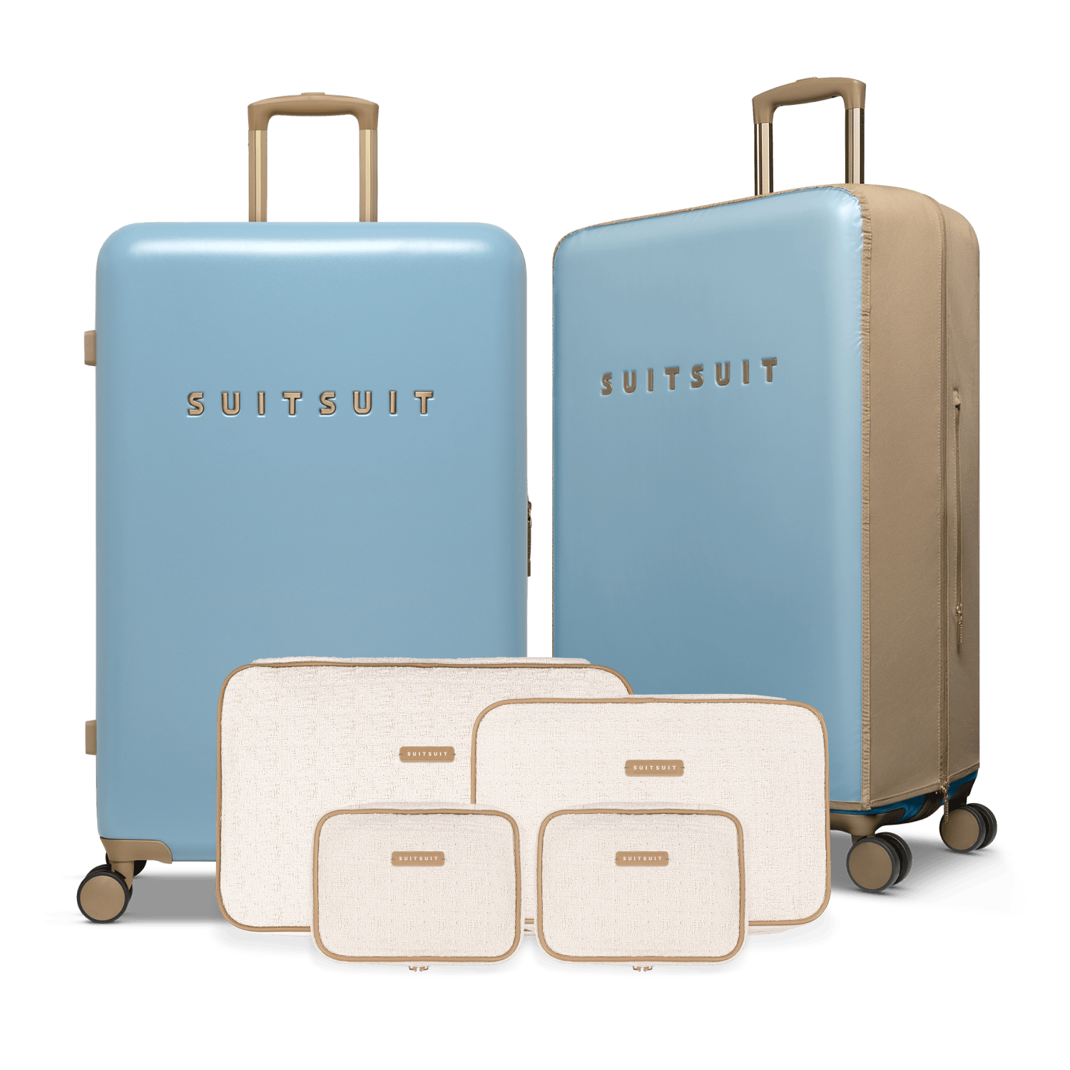 - Deze set bevat de Borrowed Blue reiskoffer (76cm), de Iced Coffee beschermhoes (76cm) en de Sloppy Cotton packing cube set (76cm).