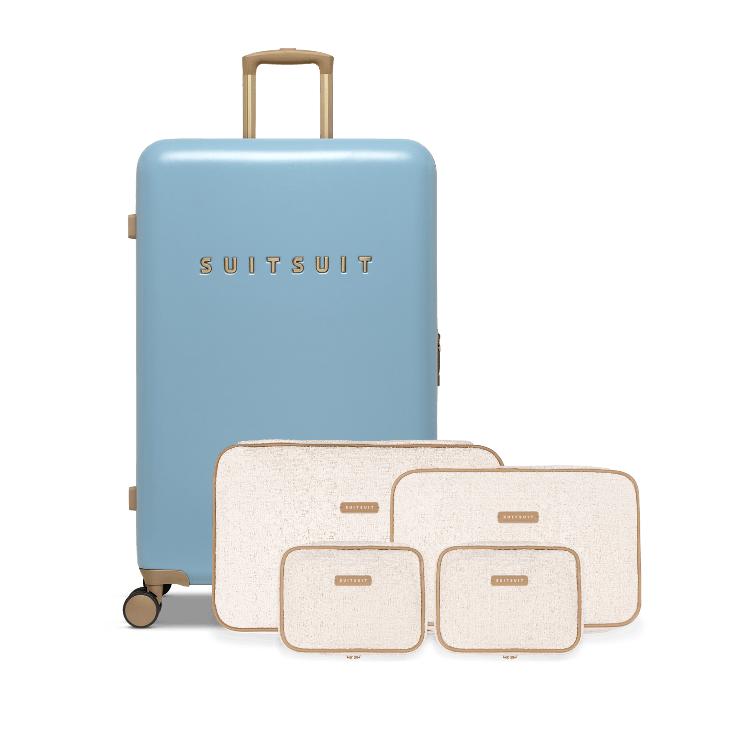 - Deze set bevat de Borrowed Blue reiskoffer (76cm) en de Sloppy Cotton packing cube set (76cm).