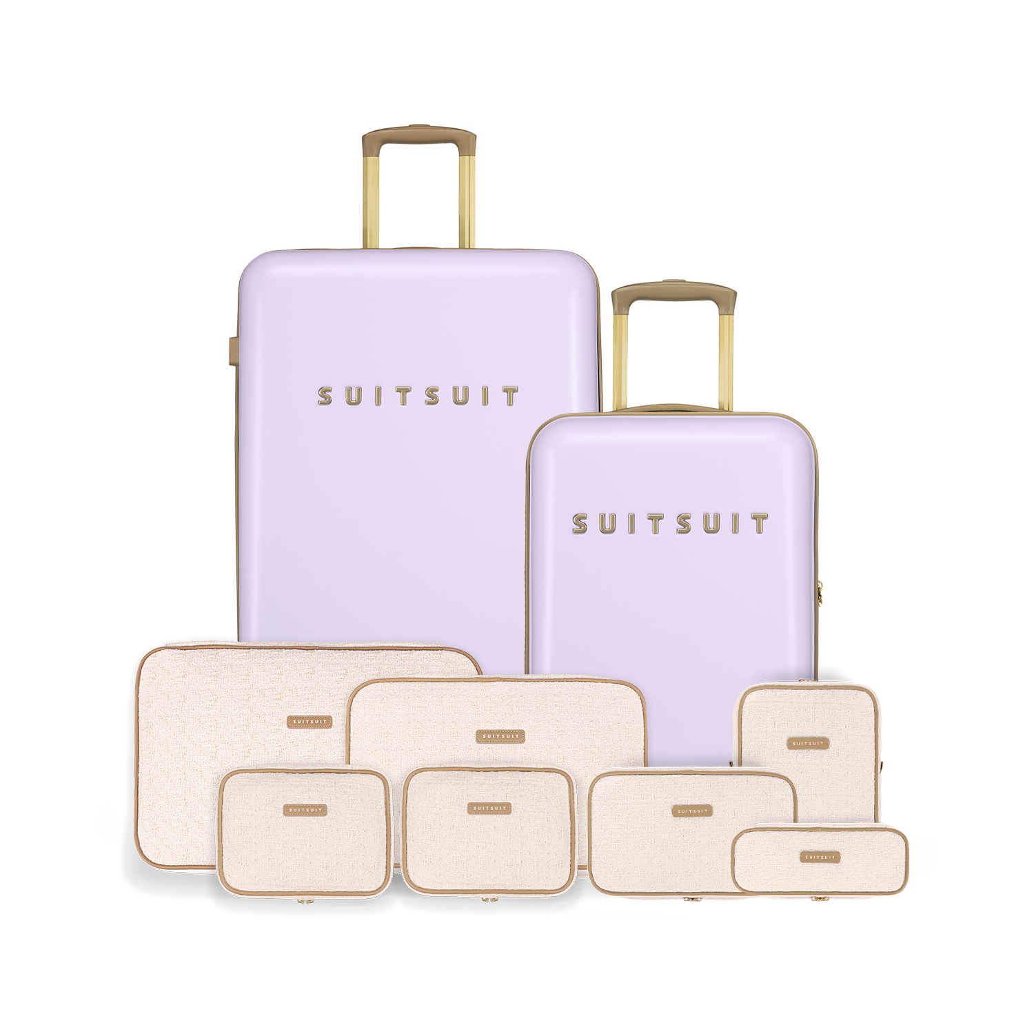 - Deze set bevat de Orchid Bloom reiskoffer (76 cm), de Orchid Bloom handbagage koffer (55 cm) en twee Sloppy Cotton packing cube sets (55 cm en 76 cm).