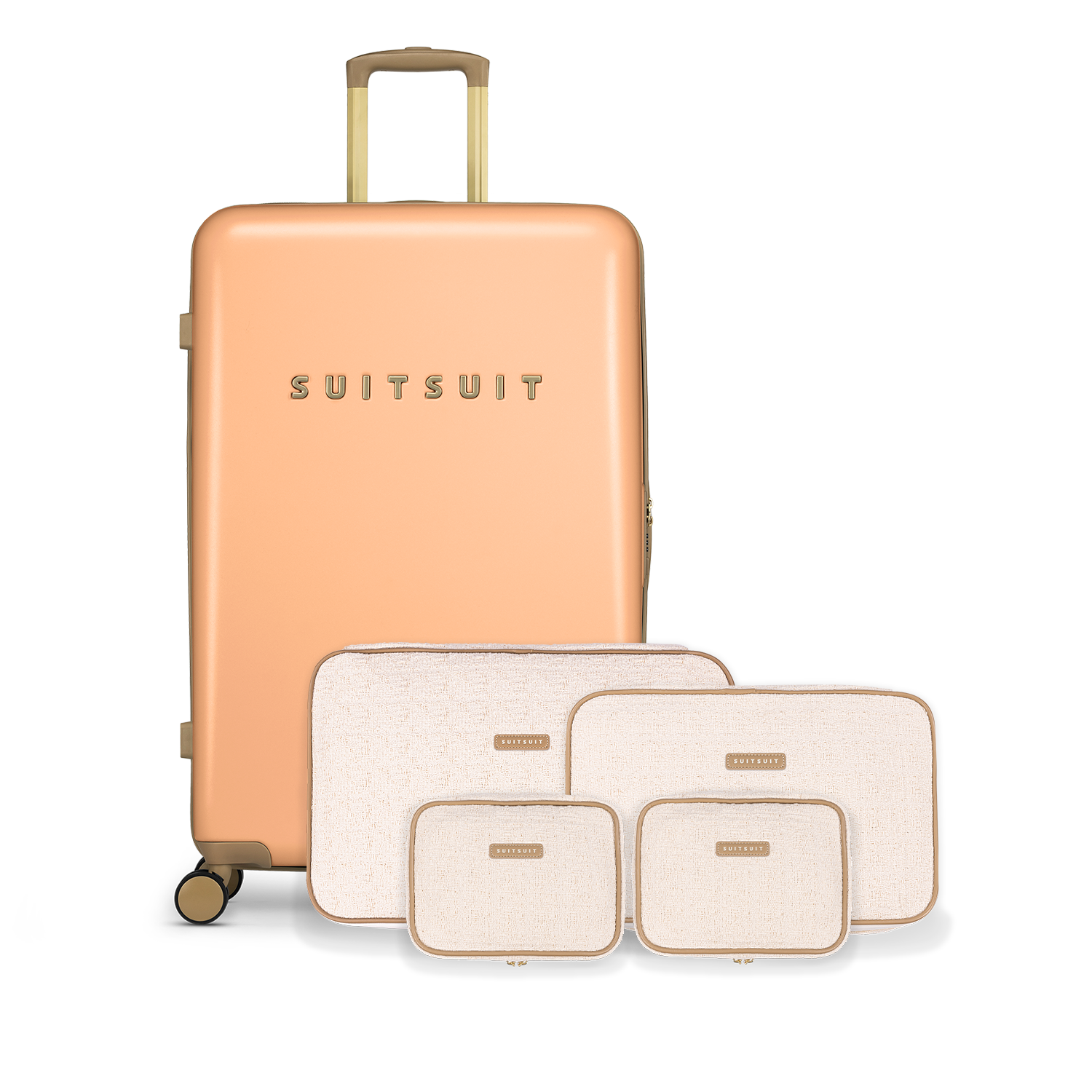 - Deze set bevat de Pale Orange reiskoffer (76cm) en de Sloppy Cotton packing cube set (76cm).