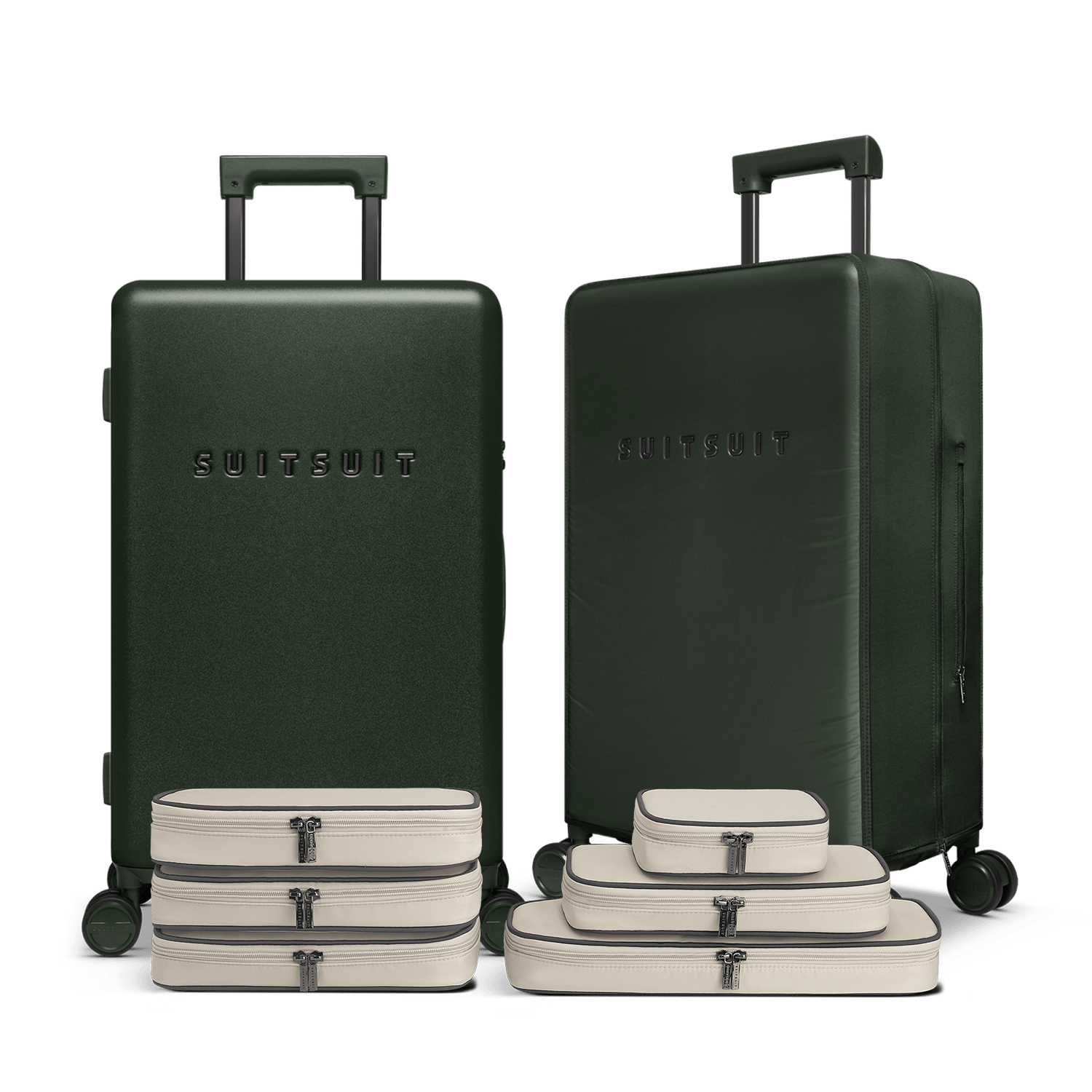 • Deze set bevat de Dark Olive reiskoffer (66cm), de Dark Olive beschermhoes (66cm) en de Faded Sand Packing Cube Set (66cm).